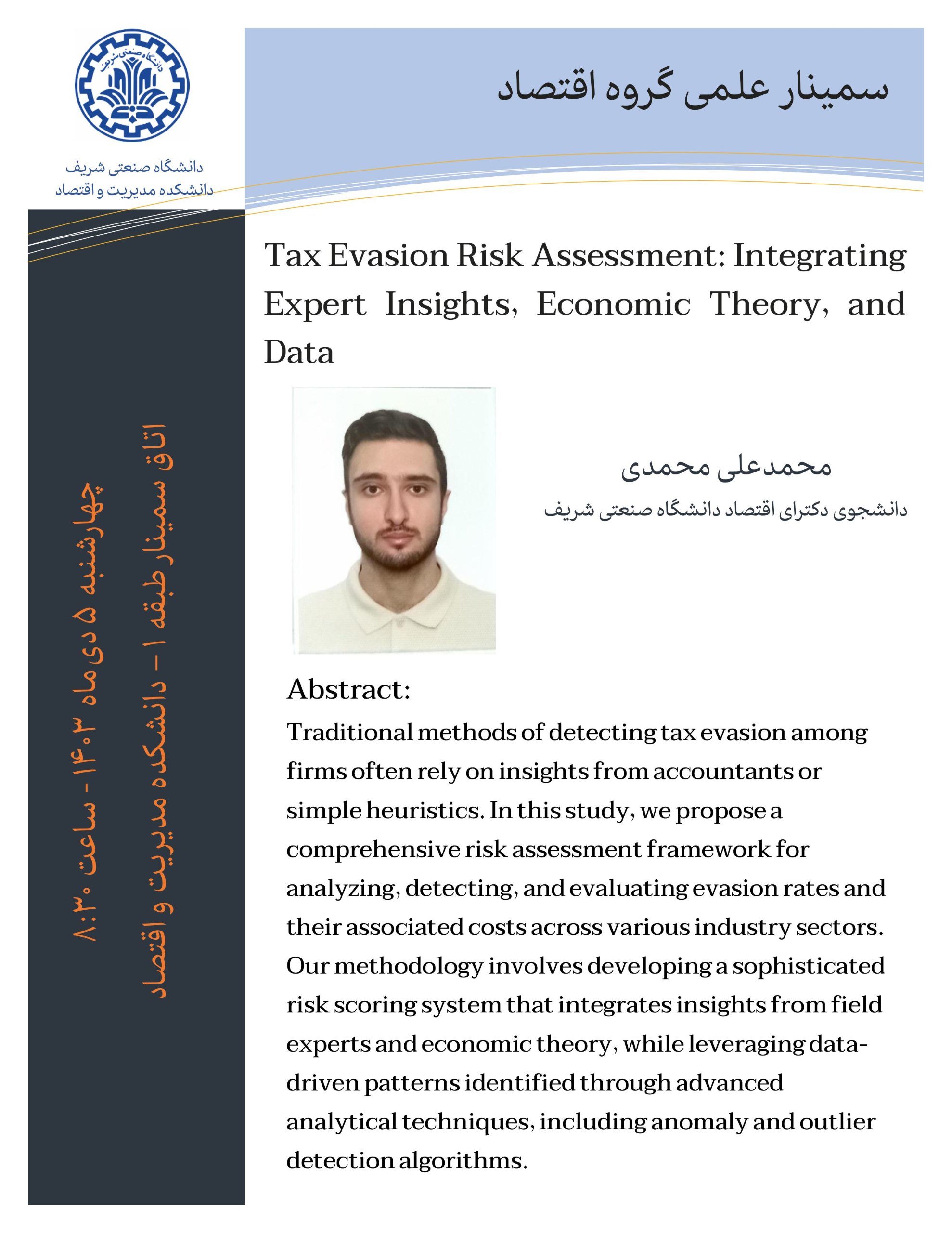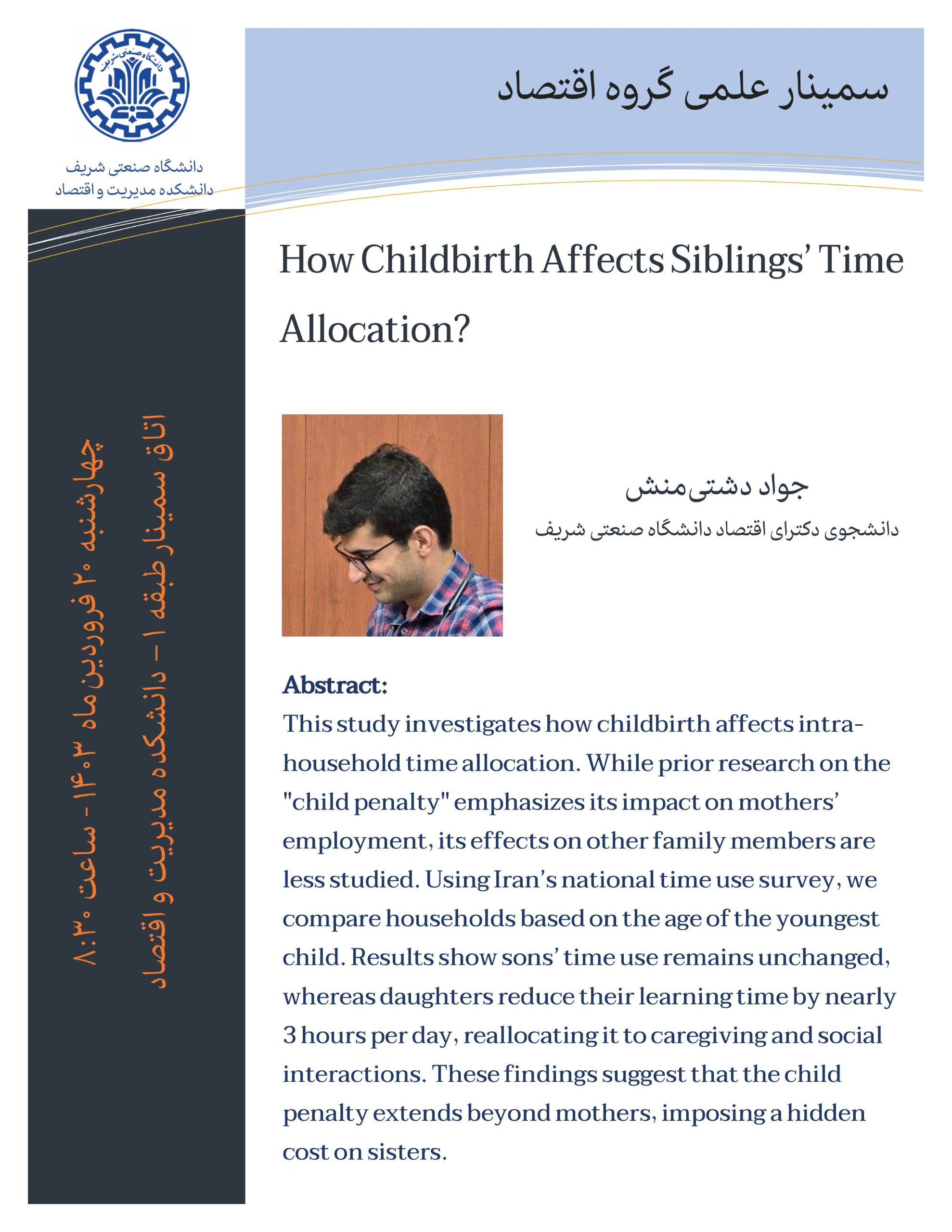 اولین سمینار علمی گروه اقتصاد سال 1404، چهارشنبه 20 فروردین 1404 ساعت 8:30 در اتاق سمینار طبق اول دانشکده مدیریت اقتصاد دانشگاه صنعتی شریف برگزار می شود. ویژه دانشجویان دانشکده مدیریت و اقتصاد...