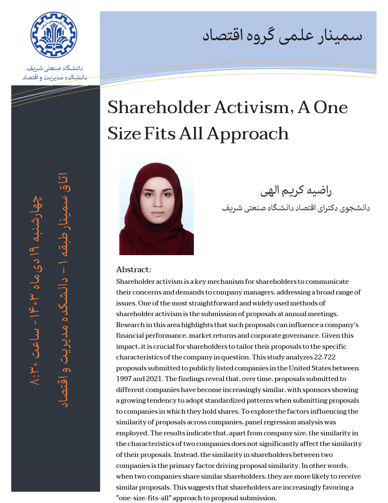 دوازدهمین سمینار علمی گروه اقتصاد سال 1403، چهارشنبه 17 بهمن 1403 ساعت 8:30 در اتاق سمینار طبق اول دانشکده مدیریت اقتصاد دانشگاه صنعتی شریف برگزار می شود. ویژه دانشجویان دانشکده مدیریت و اقتصاد...
