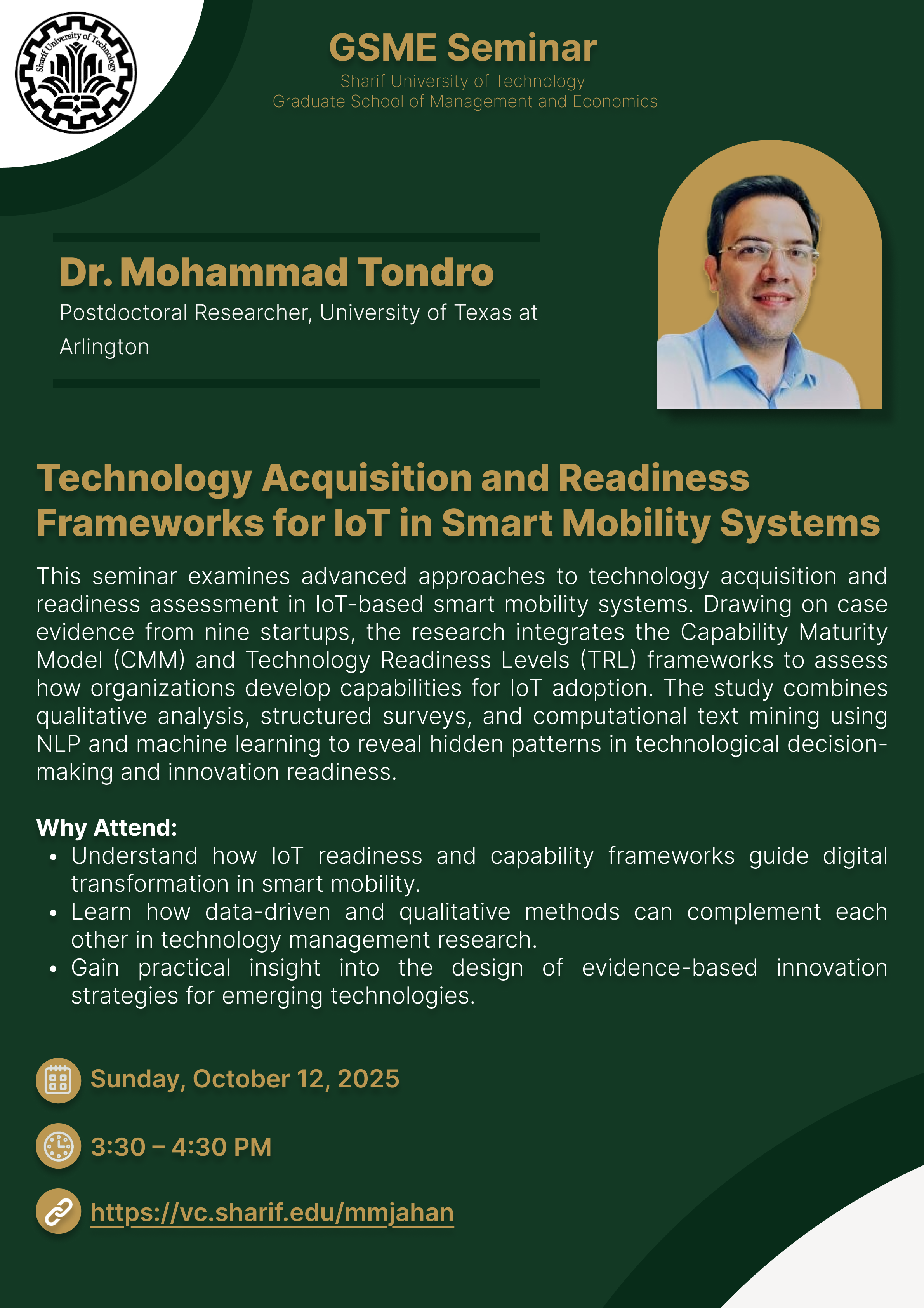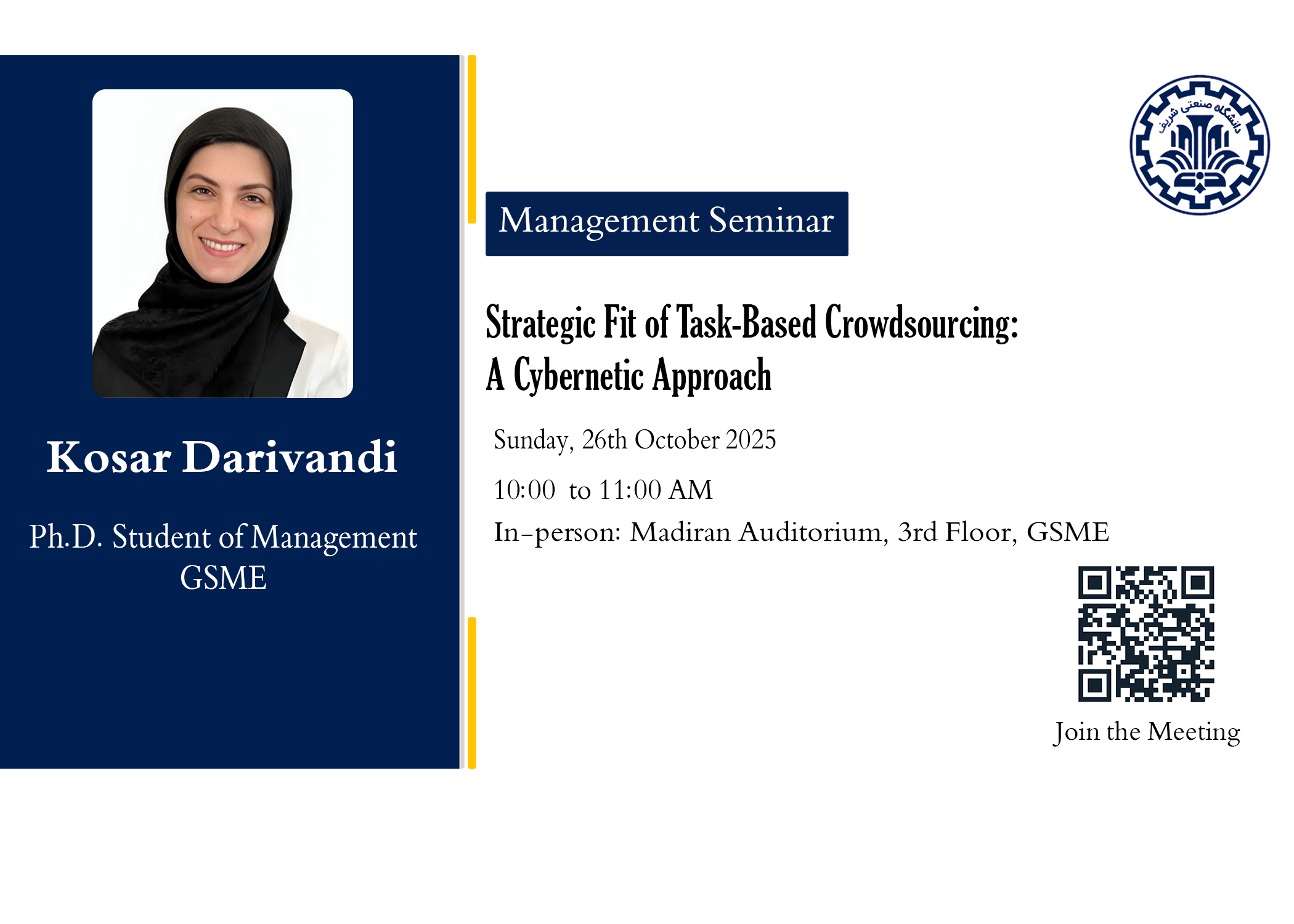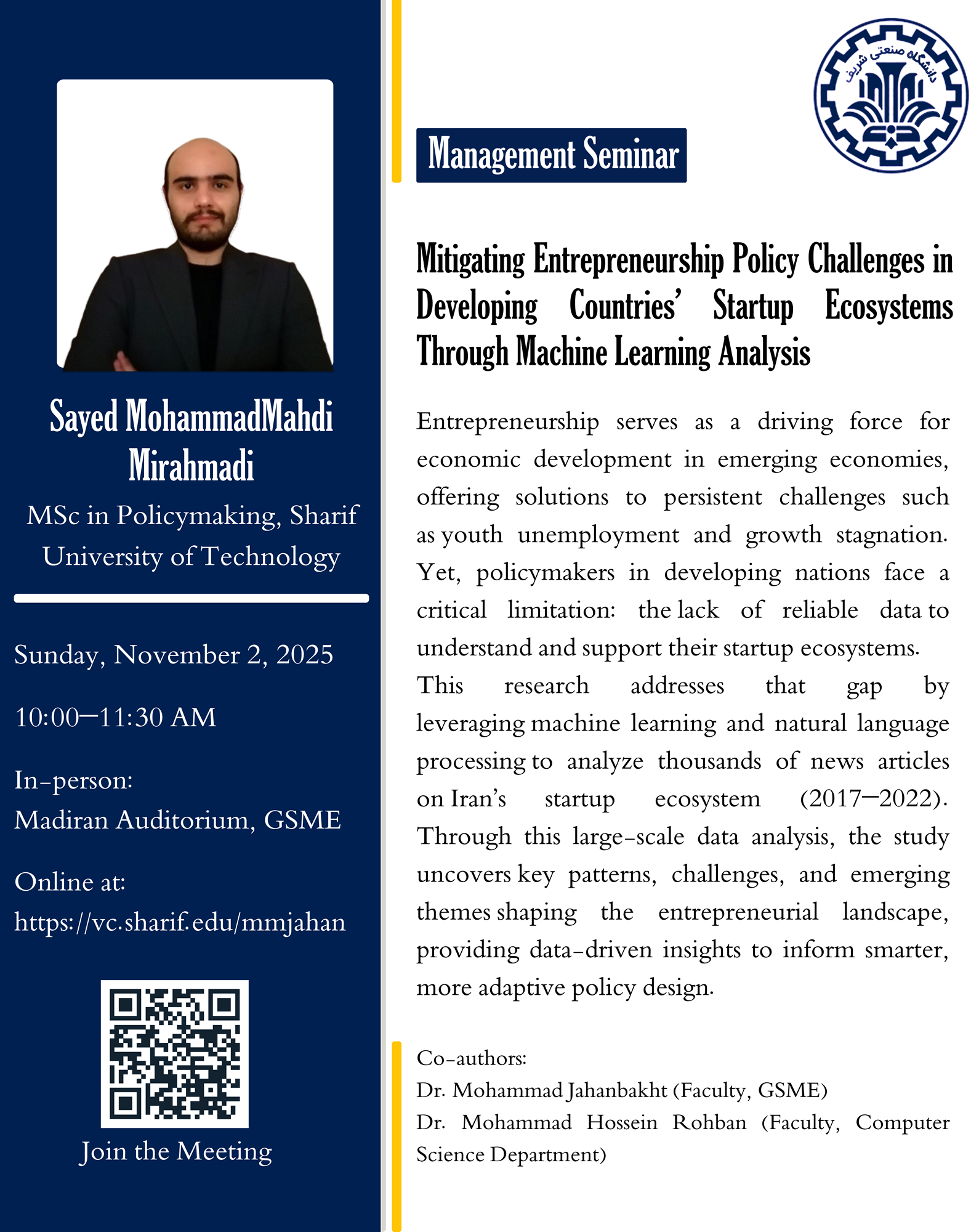 چهارمین سمینار علمی گروه مدیریت دانشکده مدیریت و اقتصاد در سال تحصیلی 1404-1405 در روز 11 آبان به صورت هیبرید برگزار میگردد. عنوان: Mitigating Entrepreneurship Policy Challenges in Developing...