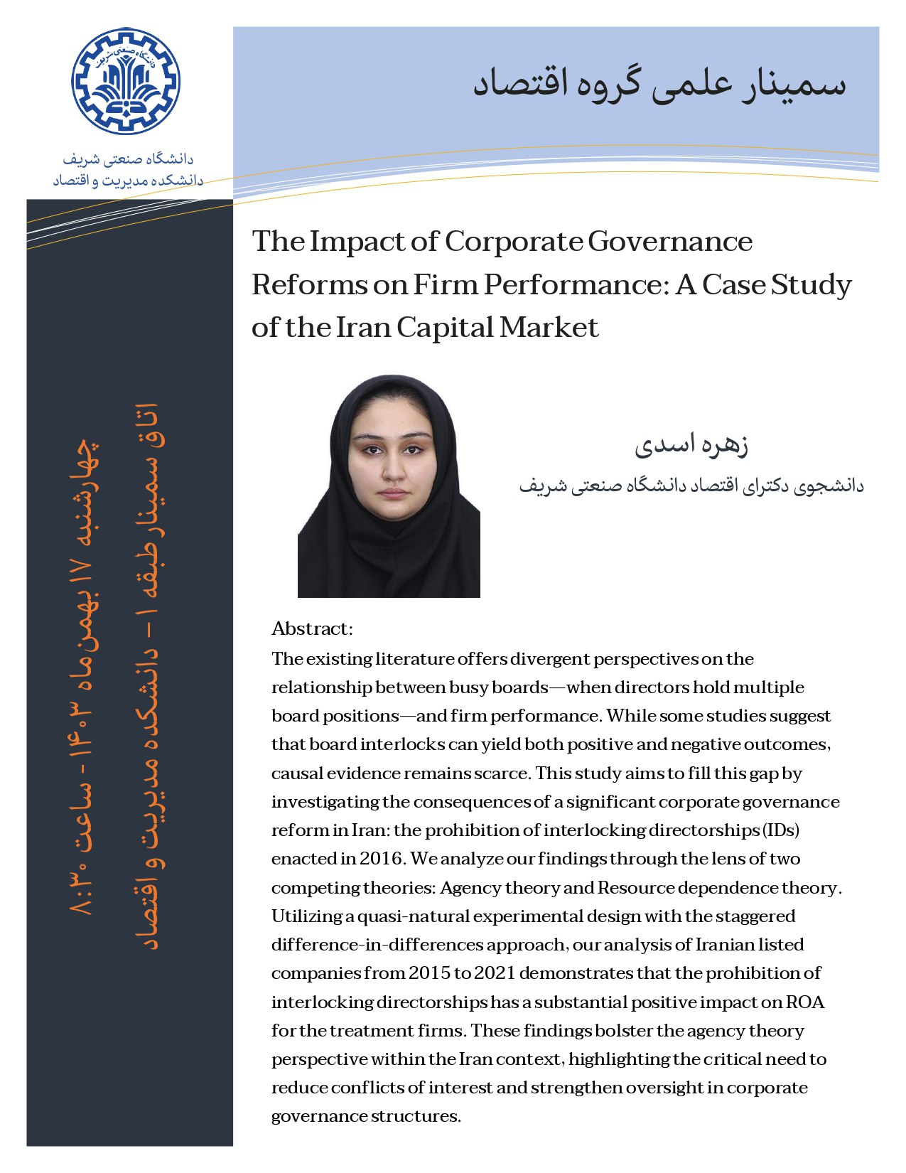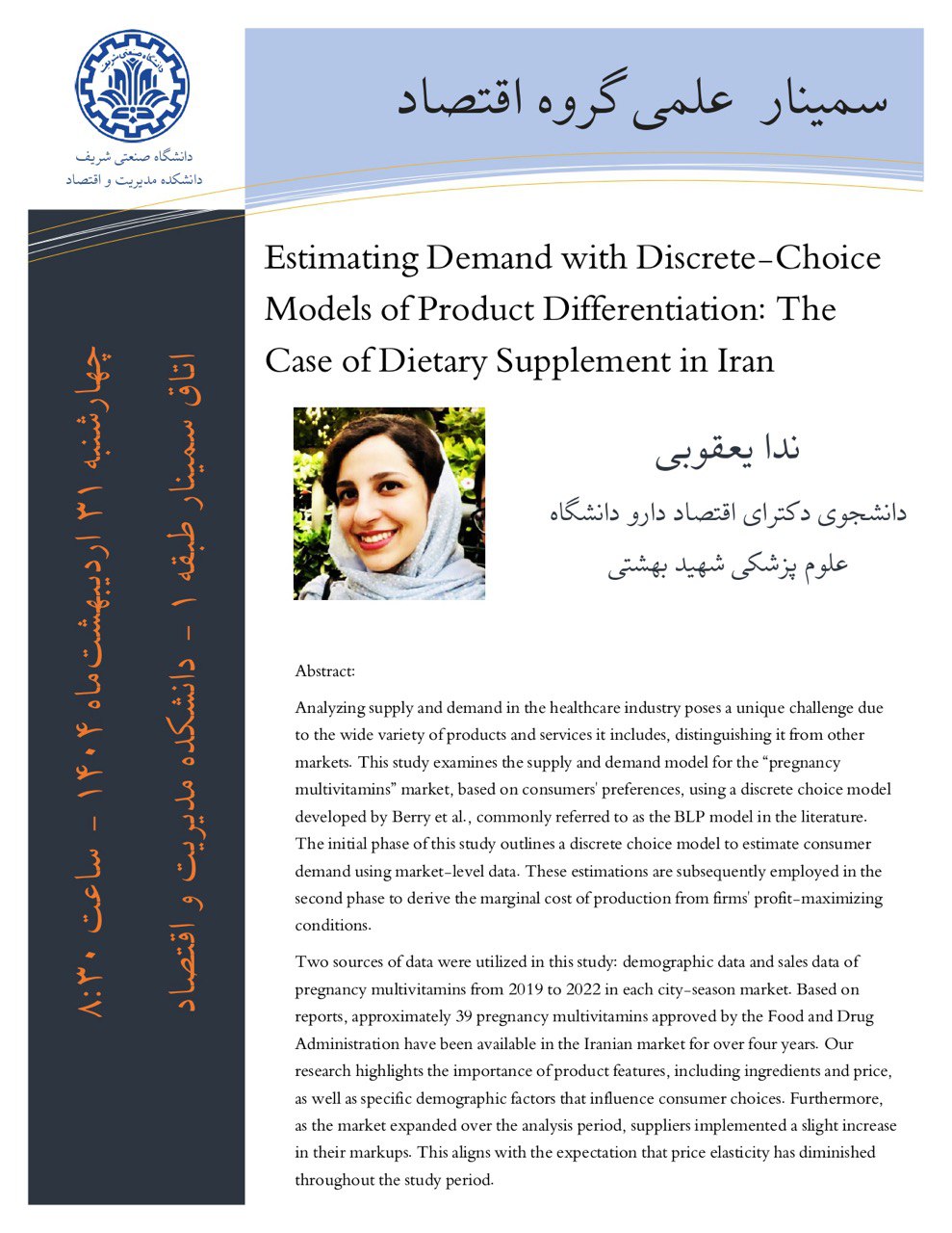 اولین سمینار علمی گروه اقتصاد سال 1404، چهارشنبه 20 فروردین 1404 ساعت 8:30 در اتاق سمینار طبق اول دانشکده مدیریت اقتصاد دانشگاه صنعتی شریف برگزار می شود. ویژه دانشجویان دانشکده مدیریت و اقتصاد...