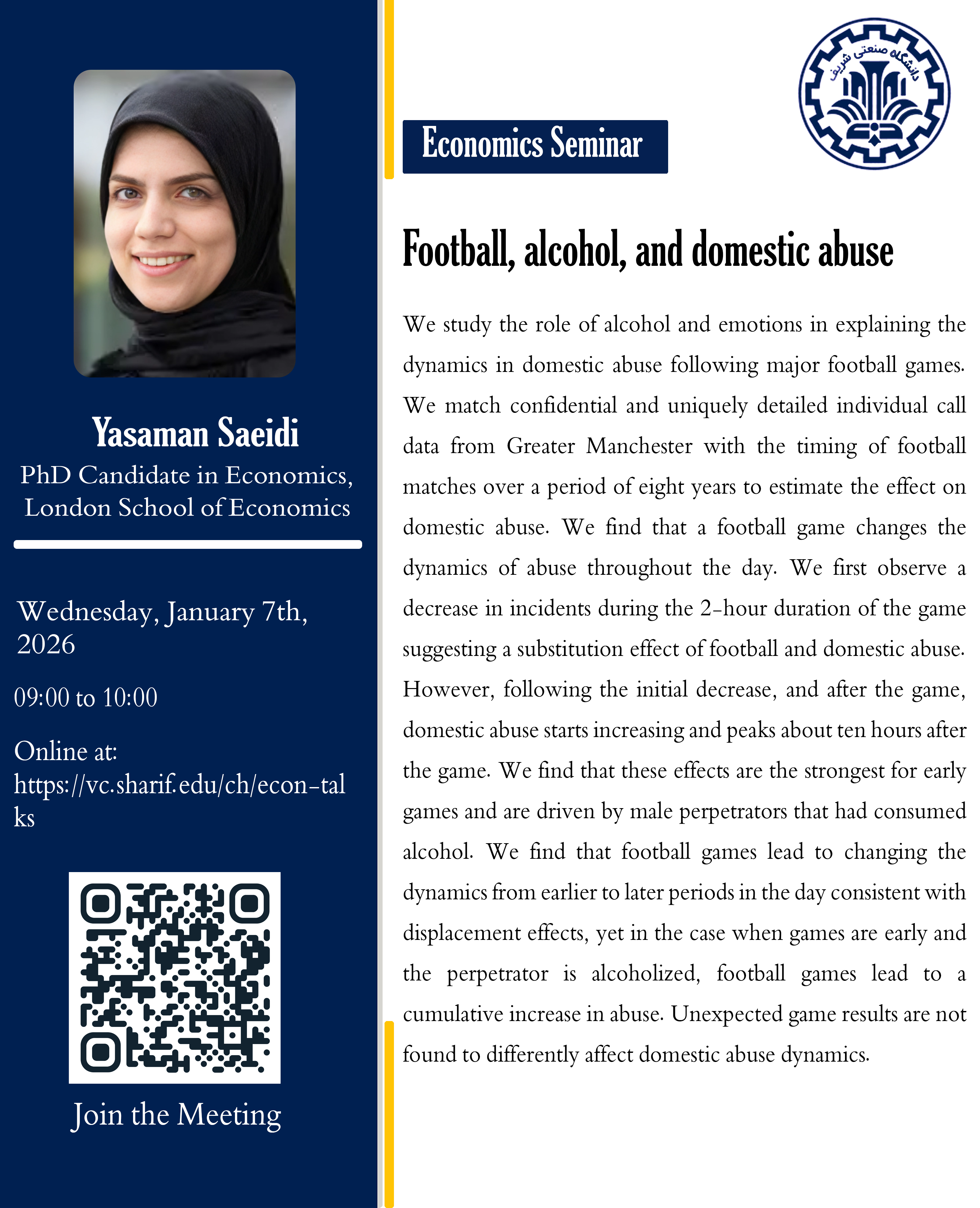 هفتمین سمینار علمی گروه اقتصاد دانشکده مدیریت و اقتصاد در سال تحصیلی 1404-1405 در روز چهارشنبه 17 دی به صورت مجازی برگزار میگردد.